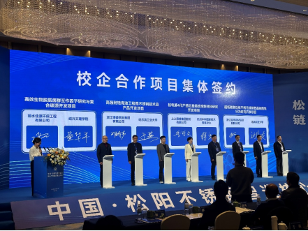 在大会签约环节,董华平副院长作为高校代表,与丽水佳源环保工程有限公司就“高效生物脱氮菌群互作因子研究与复合碳源开发”项目进行现场签约。该项目面向当前工业废水深度脱氮领域的关键技术瓶颈,聚焦生物脱氮菌群的协同作用机制与新型复合碳源的研发构建,致力于提升生物脱氮系统的处理效率与运行稳定性,为不锈钢及其相关产业的废水治理提供更具工程适用性的技术解决方案。