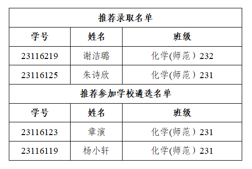 根据《绍兴文理学院“祖楠班”实施管理办法》(绍学院办发〔2023〕5号)、《化学化工学院“祖楠班”选拔实施办法》,经学生自主申请,学院综合评审,拟推荐录取谢洁璐等2位学生为第十四期卓越教师养成班“祖楠班”学员,拟推荐章演等2位学生参加学校统筹名额遴选。现予以公示,具体名单如下: